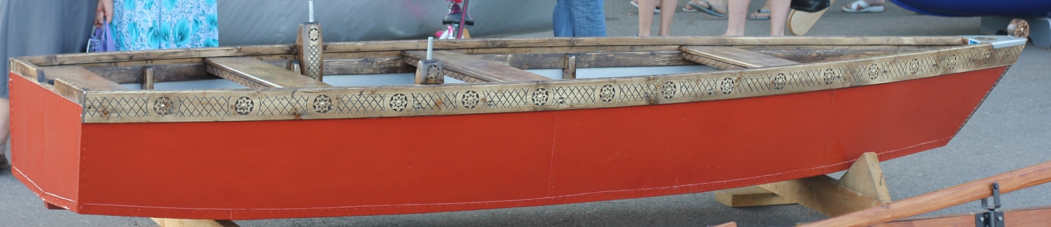 Вот моя лодка. Комбинированная, из дерева и оцинкованного железа. Лодка с резными бортами, так как одновременно она будет участвовать и в другом конкурсе, который называется «Резное узорочье лодок».