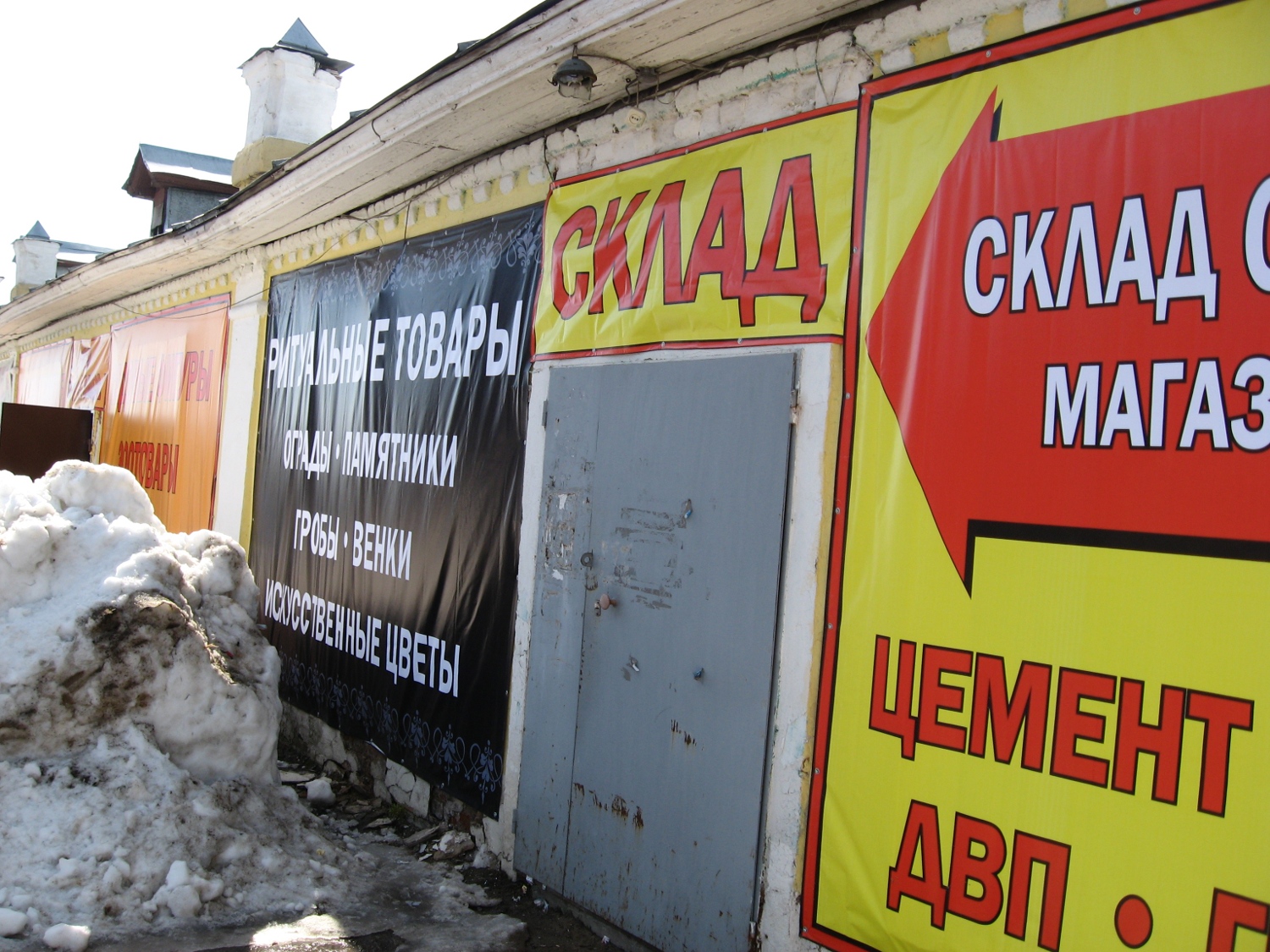 Да, все мы смертны и в селе нужен магазин ритуальных товаров. Тем более, что такая высокая смертность. Но как-то не очень уж приятно видеть в самом центре села такой плакат на черном фоне. И остальные-то эти новые рекламные баннеры не украсят площадь, но такая огромная реклама гробов, памятников и оградок совсем не нравится. Тем более, что рядом висит ещё и радостная надпись — «Мы открылись!»