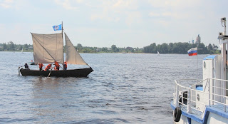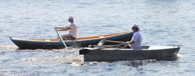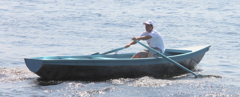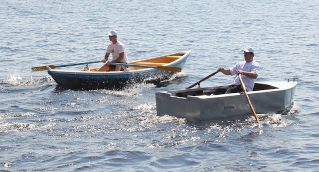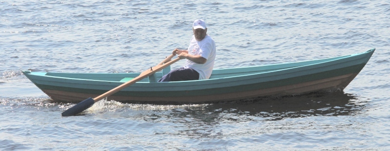 На переднем плане лодка, склепанная из оцинкованного металла, о которой я упоминал в своей первой статье про нынешний праздник. Лодочка идет очень даже легко, но немножко зарывается носом в воду, так как смещен центр тяжести. Думаю, что когда на неё навесят мотор, этого происходить не будет. Во время заезда лодка не уступала в скорости движения по воде чисто весельной лодке.
