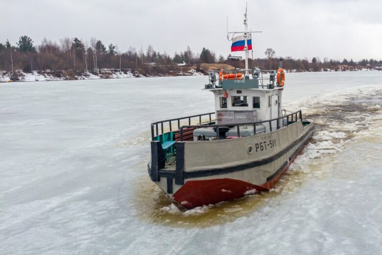 Судно ледокольного класса «РБТ-509» ломает лед в затоне ССРЗ