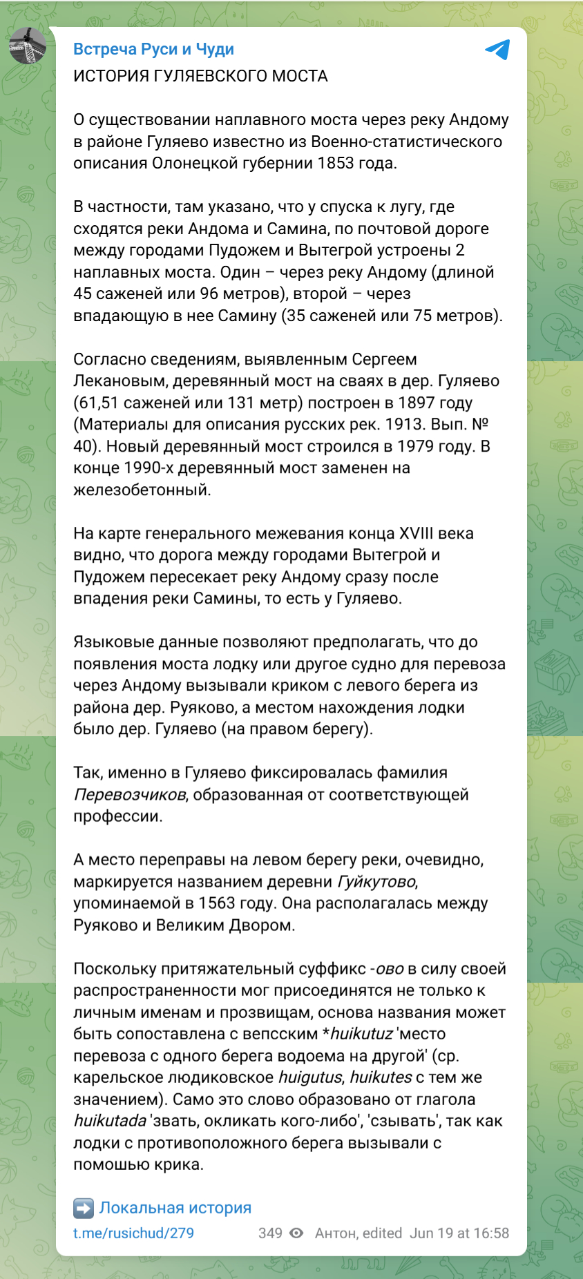 О существовании наплавного моста через реку Андому в районе Гуляево известно из Военно-статистического описания Олонецкой губернии 1853 года