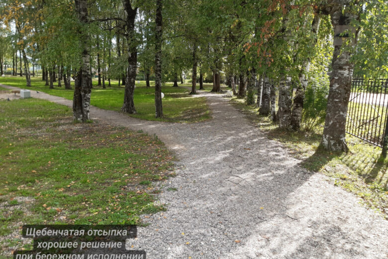- гравийная отсыпка — кроны уже поредели, вероятно, корни задели техникой;