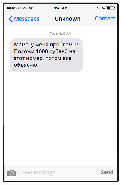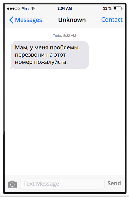 Главное правило — никогда не волноваться и не суетиться. Такие сообщения приходят обычно вечером или поздно ночью. Развод по смс самый распространенный, но не самый действенный. Пациент может не увидеть сообщение в нужный момент. Или он может быть не мама, или его ребенок дома, мило сопит в кроватке после вечерней сказки. Отправляют такие послания тоннами, в надежде, что какое-нибудь сработает. Перезванивать на такой номер бесполезно, он всегда «не абонент». Кстати, могут писать, обращаясь не к маме, реже встречается обращение «сынок» или «брат». Просто мамы самые сердобольные, их развести проще.