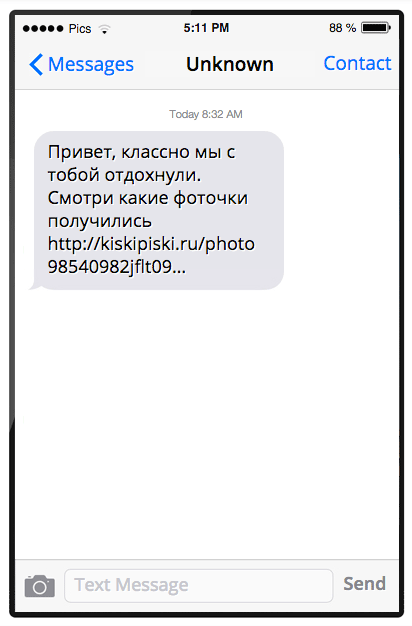 Здесь тебя хотят прихватить на любопытстве или на страхе. Вроде как ты с кем-то кутил и тут можно скачать фотоотчет с этого события. Несемейного человека толкает только любопытство, а семейного — дикий страх, ведь сикир-башка будет, если подобное действительно было. Смысл мошенничества в том, что, переходя по ссылке ты ловишь адский вирус, который либо выкачивает потихоньку деньги со счета, либо блокирует всю систему, предлагая перевести некую сумму на указанный номер телефона. Рецепт успеха: никогда не ведись на подобные штуки. Даже если ты тусовался с какой-то красоткой, то подобным образом она точно к тебе не обратится.