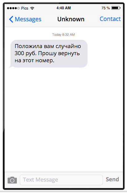 Этот способ совсем на дурака, но как показывает практика, работает и он. Просто пишут, что положили тебе деньги на телефон, и просят вернуть. Даже если ты очень честный, выжди дня три, если человек действительно где-то ошибся, то он от тебя не отстанет, даже позвонит.