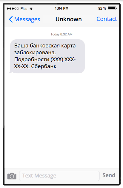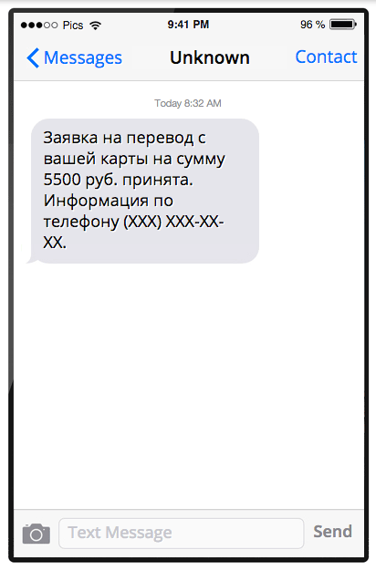 Эта схема аналогична предыдущей, но содержит больше побуждающей мотивации. Вот-вот спишут деньги! Бежать, спасать! Не суетись, никто и ничего не снимает. Посмотри историю своих смс и напомни себе, как выглядят сообщения от банка. Банки НИКОГДА так не пишут! Схема отъема денег такая же: просят сообщить конфиденциальные сведения для доступа к карте или совершить некие манипуляции в банкомате. В обоих случаях ты будешь в убытке.