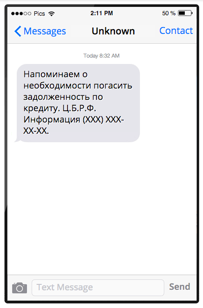 Страшно, не правда ли? Страшно тому, кто ни разу не получал сообщений от банков. Банки никогда не шлют сообщения с непонятных номеров. Обычно в поле «отправитель» стоит название банка словами. Ну и если вы не брали кредит в указанном банке, то расслабьтесь. Тем более, если подписано от лица Центрального банка Российской Федерации. Вы даже при желании не сможете взять в нем кредит.