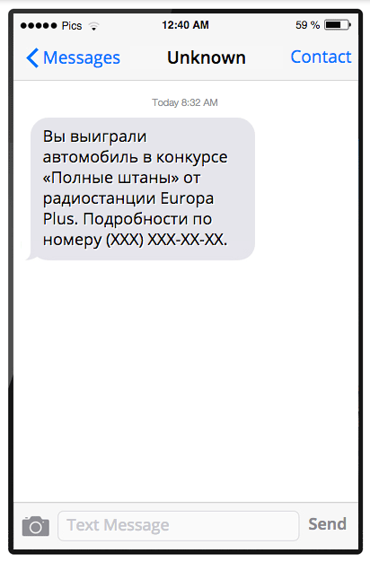 Это распространенное мошенничество. Вместо «Европы плюс» может быть другая радиостанция или даже автосалон, который разыгрывает тачки в честь собственного юбилея. Если позвонить по такому номеру, то будет два варианта. Тебя будут долго расспрашивать, записывать данные, просить подождать на линии или еще как-то затягивать разговор, постоянно поздравляя с выигрышем. В итоге тебе придет приличный счет за звонок на платный номер. Второй вариант — тебя попросят оплатить налог на выигрыш через терминал или в руки курьеру. Выигрыши действительно облагаются налогом. Но, во-первых, чтобы выиграть надо сначала участвовать в розыгрыше, а во-вторых, оплата налога через терминал или курьеру, без посещения офиса — это совсем по-детски. Но жажда халявы велика, люди ведутся и на такое.