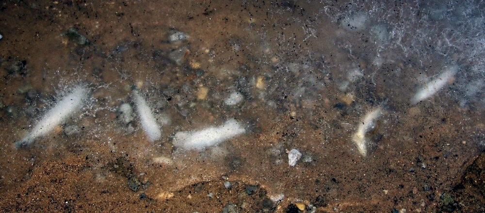 Видно, что рыбки погибли уже давно (начали разлагаться даже в холодной воде), наверное, через несколько дней после того, как их выпустили в реку. Часть из них подберет налим, который сейчас поднимается в верховья на нерест; он не гнушается и падалью, а часть просто будет разлагаться на дне.