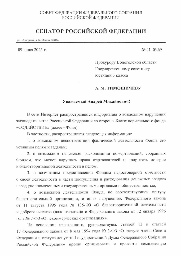 Сенатор от Вологодской области Евгений Богомазов обратился к областному прокурору Андрею Тимошичеву с просьбой провести проверку благотворительного фонда «Содействие».