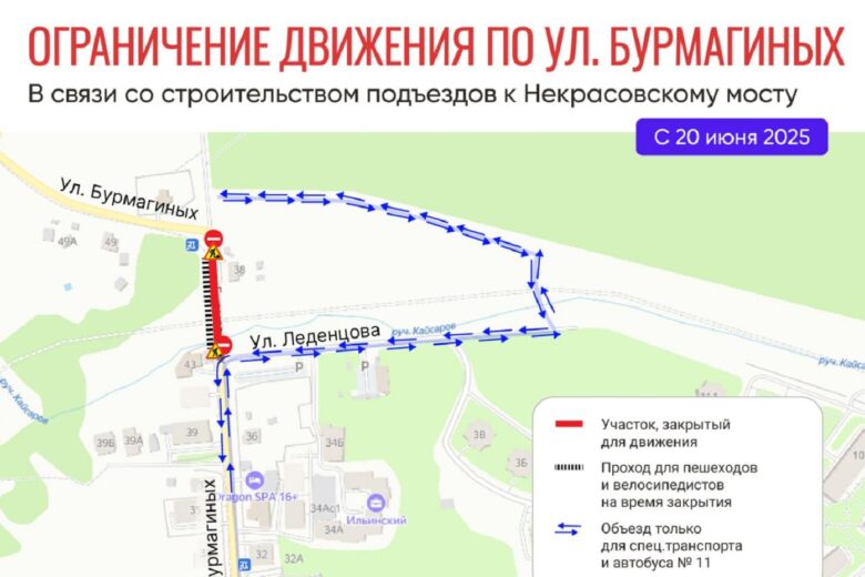 «Для проведения необходимых работ с 20 июня участок улицы Бурмагиных в районе пересечения улицы с Кайсаровым ручьем будет перекрыт для движения транспорта. Исключение составит общественный транспорт (по этой улице курсирует автобус №11), а также транспорт экстренных служб. Проход для пешеходов также будет сохранен – они смогут двигаться по тротуару с левой стороны дороги. Ограничение продлится пять месяцев», - пояснили в пресс-службе городской администрации.