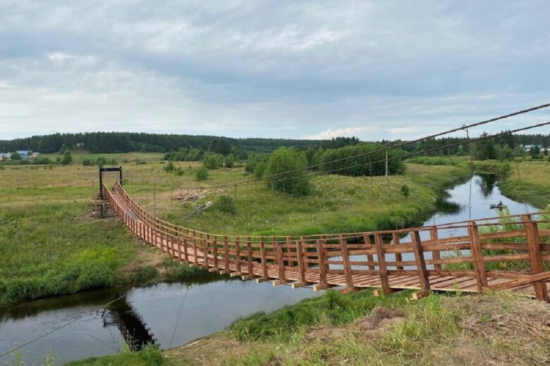 На обрушившемся мосту демонтировали старые конструкции, заменили опоры, установили деревянные балки на подвесах из бруса и перила, натянули новые тросы, в том числе дополнительный страховочный. Также укрепили конструкцию, чтобы она меньше раскачивалась при эксплуатации.