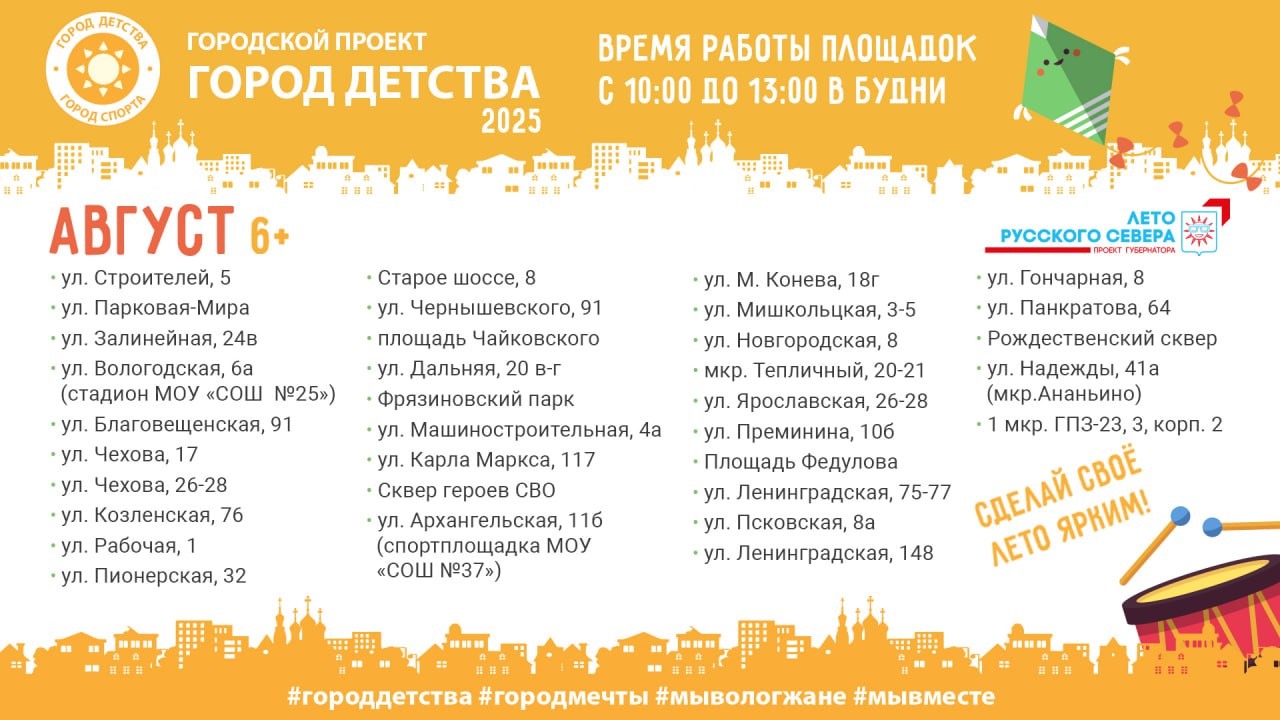 В августе, как и в июле, в Вологде будет работать 34 площадки городского проекта «Город детства». Но ряд игровых городков поменяет адреса, поскольку по соседству появились новые современные детские площадки.