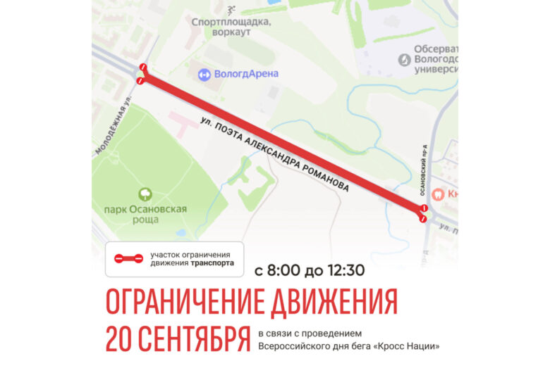 Улицу Поэта Александра Романова закроют для движения транспорта в эту субботу, 20 сентября, с 08:00 до 12:30. Ограничение коснется участка от улицы Молодежной до Осановского проезда. Это связано с проведением на этом отрезке дороги массового забега «Кросс нации».