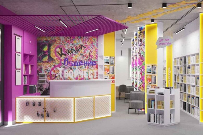 В соответствии с концепцией в отделке библиотеки будут использованы акценты из ярких малинового и желтого цветов, граффити, металлические элементы, а также неоновая подсветка.