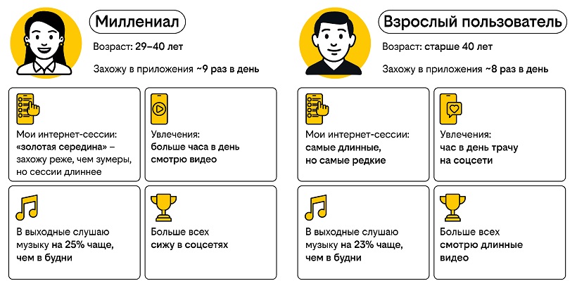 Зумеры (им сейчас примерно 16-28 лет) постоянно переключаются между мессенджерами и соцсетями, причем заходят в них ненадолго. По выходным их экранное время вырастает на 30% по сравнению с будними днями. А вот абоненты Билайн старше 40 лет более усидчивые: они используют приложения реже, но дольше остаются онлайн. К тому же интернетом они используются практически одинаково как в будни, так и в выходные.