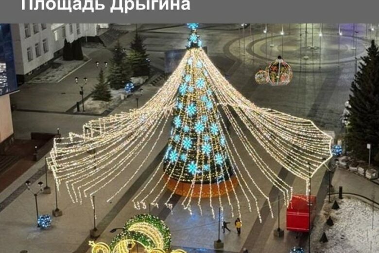 Площадь Дрыгина — новогодняя ель с шатром и световая надпись "2026"