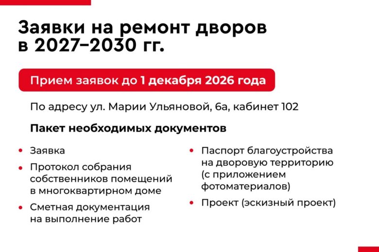 «Всего с 2017 по 2025 год в областной столице благоустроили 400 дворовых территорий. В 2026 году отремонтируем еще порядка 20 дворов, сейчас формируем перечень территорий. Что касается периода с 2027 по 2030 год, то сейчас идет прием заявок от жителей. Он продлится до 1 декабря 2026 года. Вологжанам важно подать заявку с полным пакетом документов, согласно утвержденному порядку, на основании которого будет проведено ранжирование и утвержден список дворовых территорий», — отметил глава Вологды Сергей Жестянников.