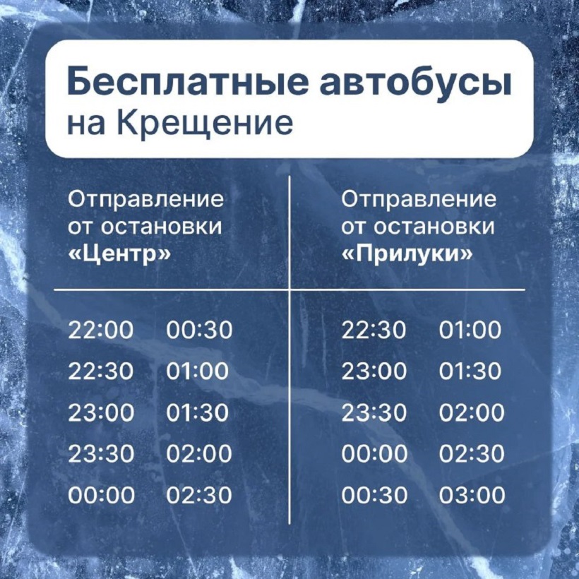 В Вологде в Крещенскую ночь организуют два бесплатных автобуса для желающих окунуться в купель. По словам главы Вологды Сергея Жестянникова, в кабинах автобусов будут установлены таблички «Крещенский автобус».