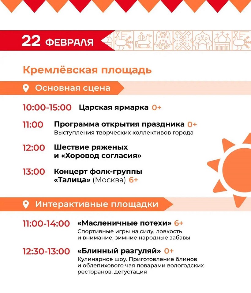 «В 12:00 на площади начнется шествие и большой праздничный хоровод. Параллельно будет проходить «Блинный разгуляй», шеф-повара городских ресторанов организуют для вологжан бесплатную дегустацию традиционных вологодских блинов и фирменного облепихового чая. В 13:00 на сцене выступит московская фолк-группа «Талица», - написал Жестянников в Telegram-канале.
