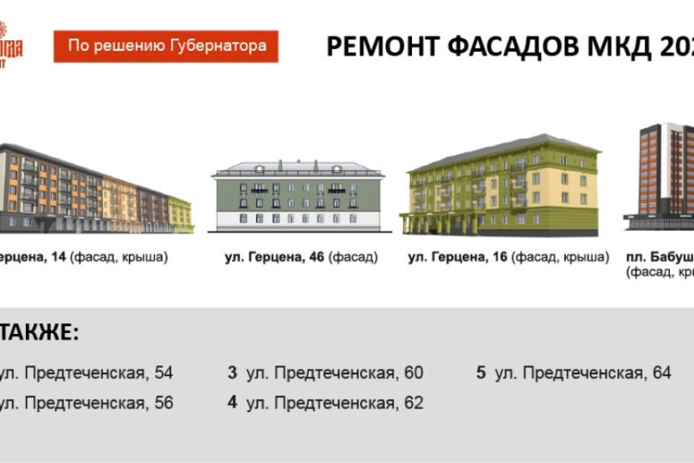 Помимо этого, отремонтируют фасады пяти домов на улице Предтеченской, а именно № 54, 56, 60, 62, 64. На некоторых из них в порядок приведут еще и крыши.