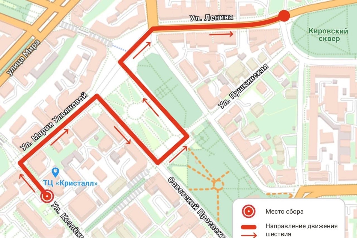 Сбор участников акции начнется в 9:00 на ул. Козленской у ТЦ «Кристалл» (ул. Козленская, 3). Само шествие начнется в 10:00. «Бессмертный полк» пройдет по улицам Козленской, Марии Ульяновой и Советскому проспекту. В районе улицы Пушкинской колонна повернет на площадь Революции, прошествует мимо Вечного огня и выйдет на улицу Ленина. Завершится шествие в Кировском сквере.