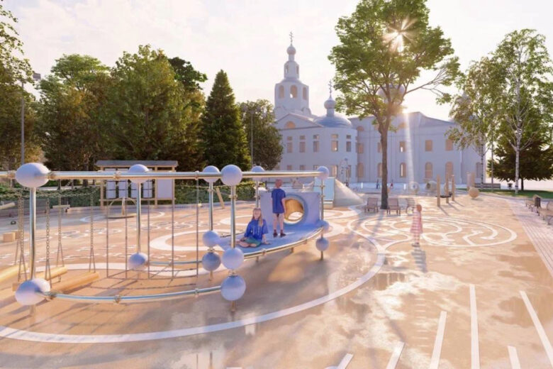 На территории обустроят большой детский комплекс с каруселями, качелями, батутами, туннелями и игровым фонтаном. Будут и музыкальные инструменты — уличный ксилофон и трубчатые колокола.