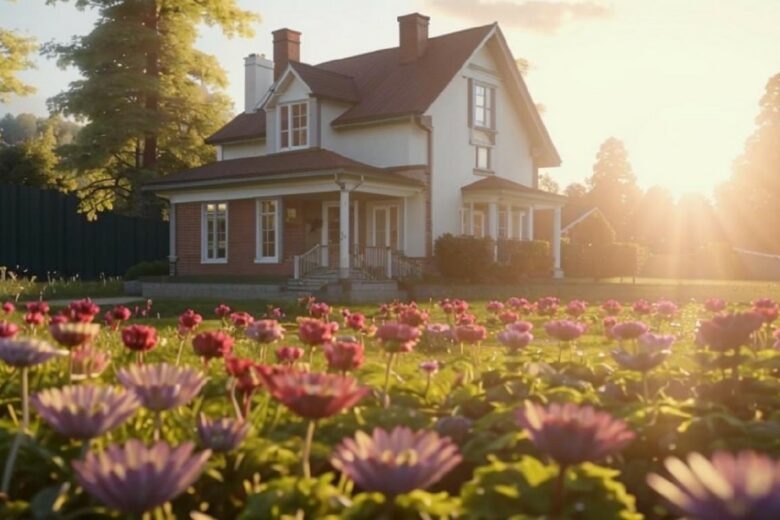 Источник фото: нейросеть Кандинский Дачный дом ранним утром среди цветочных клумб (нейросеть Кандинский)