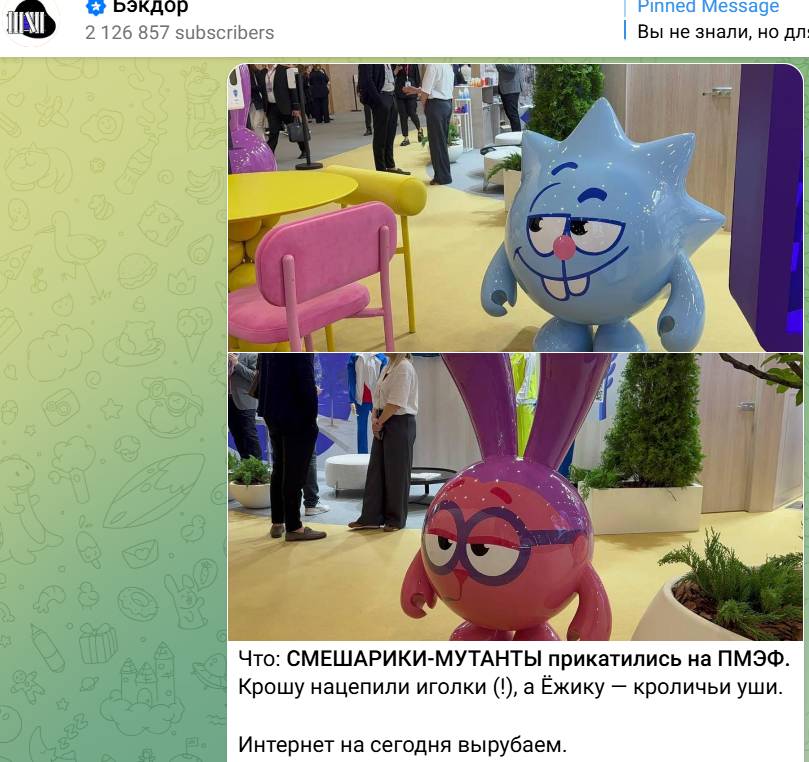 Только представьте, маленькие монстры с лицами Набиуллиной и Лаврова и Смешарики, поменявшиеся телами. Что это? Что государство транслирует нашей молодежи через такие образы? Вместо того, чтобы придумать какого-то своего героя, доброго и милого, дающего отсылку к традиционным ценностям, о которых так много говорят, организаторы решили сделать рекламу на трендовых западных игрушках (монстрах) и странной теме со сменой обличия Смешариков. Хорошо хоть Нюшу с Барашем не поменяли местами. Мы молчим про эстетику, ее в принципе нет. Получается, что пиар ПМЭФ встает выше всех высоких идеалов, о которых говорят представители власти.