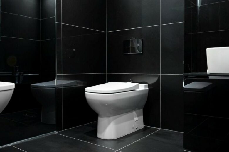 Источник фото: нейросеть Кандинский черный интерьер туалета с белым унитазом (нейросеть Кандинский)