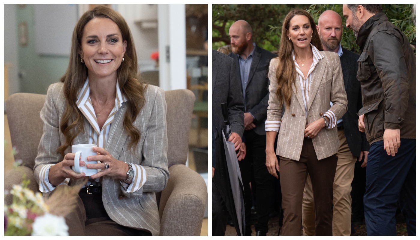 Свой комплект принцесса Уэльская представила на днях, посетив больницу в Колчестере. И доказав вневременную повестку полосатой рубашки. Но Кейт предпочла вариант в коричнево-бежевую и белую полоску.
