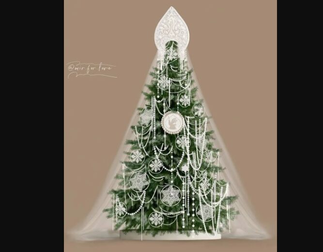Дизайнеры и мастера несколько месяцев вручную создавали кружевные украшения по специально отобранным сколкам, подобранным торговым домом «Вологодские сувениры». Ель будет больше похожа не на дерево, а на невесту: из кружева изготовлены снежинки, им же украшен кокошник, расположенный на макушке вместо звезды.