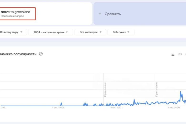 На фоне этих приготовлений по смены флага Гренландии люди по всему миру массово ищут способы переехать туда. Количество поисковых запросов в Google по теме «переезд в Гренландию» достигло рекордного уровня. Причина – заявления властей США о планах выплачивать жителям Гренландии до 100.000$ в обмен на поддержку отделения от Дании.
