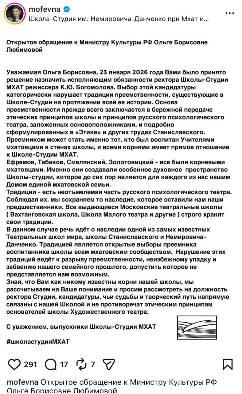 В Telegram-канале актриса театра и кино, журналистка и телеведущая, пыталась объяснить свою точку зрения, и почему она поддержала данное открытое письмо. Назначение Богомолова и. о. ректора Школы-студии МХАТ она назвала кощунством.