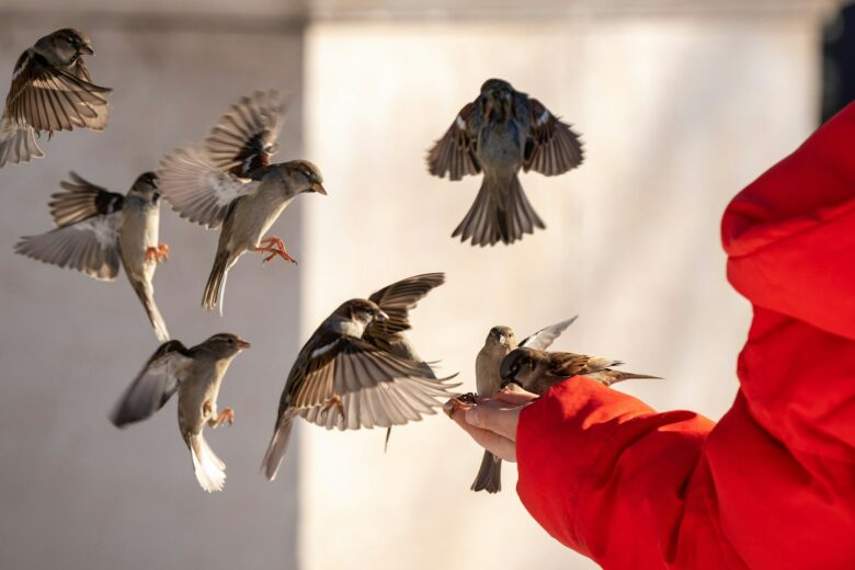 Найдите место, где собираются воробьи — куст, кормушку или просто двор. Можно взять с собой несолёные семечки.