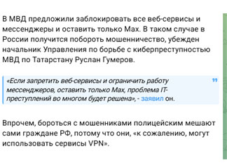 В то же время представители правоохранительных органов высказывают идеи ещё более радикального регулирования. Так, начальник управления по борьбе с киберпреступностью МВД по Татарстану Р.Гумеров возможность блокировки веб-сервисов и ограничения работы мессенджеров с сохранением только MAX, заявив, что это помогло бы значительно снизить уровень IT-мошенничества. Он также отметил, что борьбе с преступлениями мешает использование гражданами VPN-сервисов. Хотя предложение не является федеральной политикой, сам факт его публичного обсуждения демонстрирует направление дискуссии внутри силовых структур.