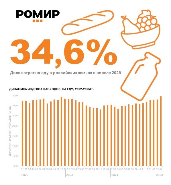 В последний раз, по данным “Ромир”, россияне тратили на еду больше своих средств только в далеком 2020 году, когда доля расходов на продукты питания достигала 37%.