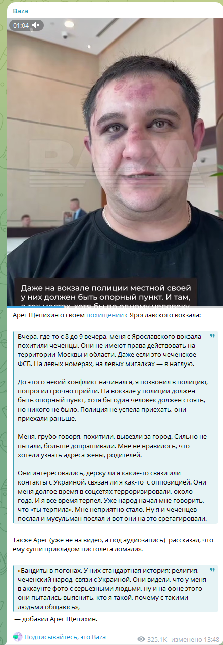 «Бандиты в погонах. У них стандартная история: религия, чеченский народ, связи с Украиной. Они видели, что у меня в аккаунте фото с серьезными людьми, ну и на фоне этого они пытались выяснить, кто я такой, почему с такими людьми общаешься», — добавил Арег Щепихин.