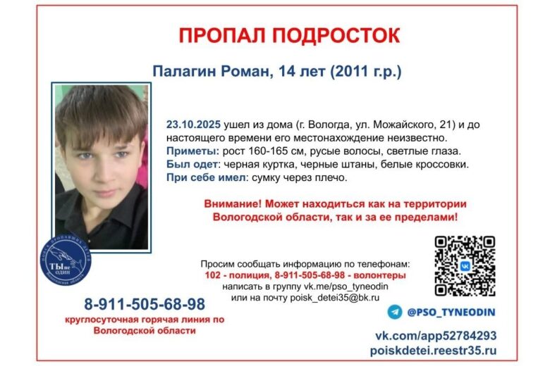 Полиция и волонтёры ПСО «Ты не один» просят всех, кто видел мальчика или знает о его местонахождении, срочно позвонить по телефонам: 102 или 8-911-505-68-98. Подросток может находиться как в Вологодской области, так и за её пределами.