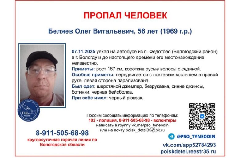 В Вологодском округе пропал 56-летний Олег Беляев, которого не могут найти с 7 ноября. Как сообщает поисково-спасательный отряд «Ты не один», мужчина уехал 7 ноября из поселка Федотово в Вологду и пропал.