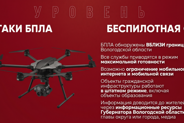 Угроза атаки БПЛА означает, что дроны уже на нашей территории. Тогда власти обычно включают сигналы оповещения (сирены, громкоговорители), отправляют СМС (не все операторы почему-то делают эту рассылку). Подробную информацию до населения доводит глава муниципалитета. Например, в Череповце это Андрей Накрошаев, а в Вологде - Сергей Жестянников. Но поскольку они часто ссылаются в этих случаях на губернатора Георгия Филимонова, то рекомендуем подписать и на его страничку. Мобильную связь и интернет ограничат (белый список должен работать, по крайней мере там, где связь глушат не предприятия, а только операторы. Домашний интернет и Wi-Fi - без ограничений). Также возможна угроза объектам инфраструктуры.