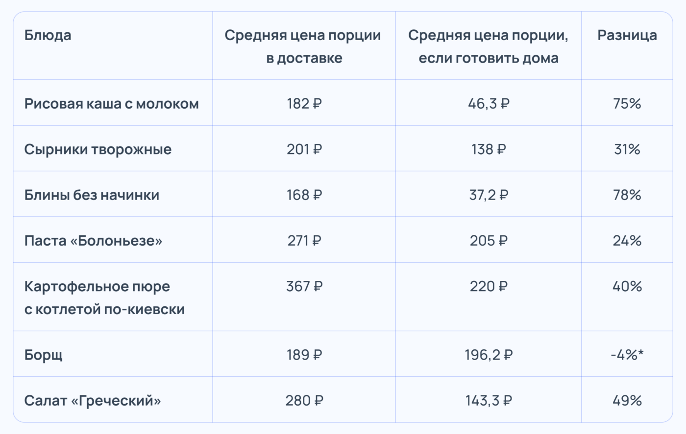 Вывод очень прост, практически все блюда, за исключением борща, при самостоятельном приготовлении обходятся дешевле, и намного. Только борщ оказался дороже на 4%, поскольку его приготовление в больших количествах выходит экономичнее, за счет объема.