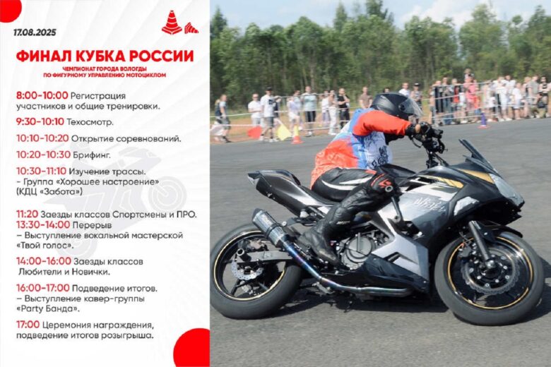 В частности, кубок города по джимхане пройдет в субботу. Местные спортсмены продемонстрируют мастерство управления мотоциклом в сложных условиях. Уже в воскресенье пройдет финал кубка России – первое подобное масштабное соревнование в истории Вологды. Соревнование соберет лучших спортсменов со всей страны. Заезды начнутся в 10:00.