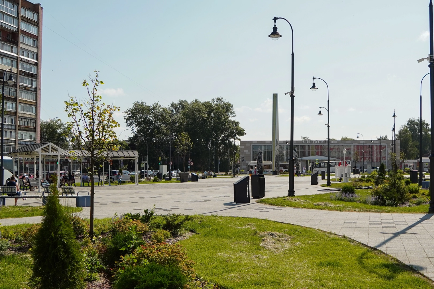 На площади уже смонтированы все фонари и постелен газон